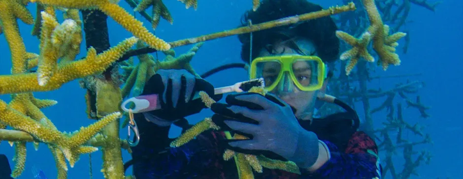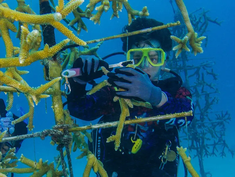 To plant coral, Scouts on the Scuba Advanced Marine Exploration adventure scuba dive one to six miles offshore where lifeless coral skeletons litter the ocean floor. Sea Base staff guide the Scouts down into about 30 feet of water to an underwater nursery, where they help clean algae off coral trees. Then, Scouts help take corals from the nursery to the reefs, where they attach them using a marine epoxy. Coral reefs cover less than 1% of the ocean floor, but scientists estimate that nearly a quarter of ocean life relies on them for food and shelter.