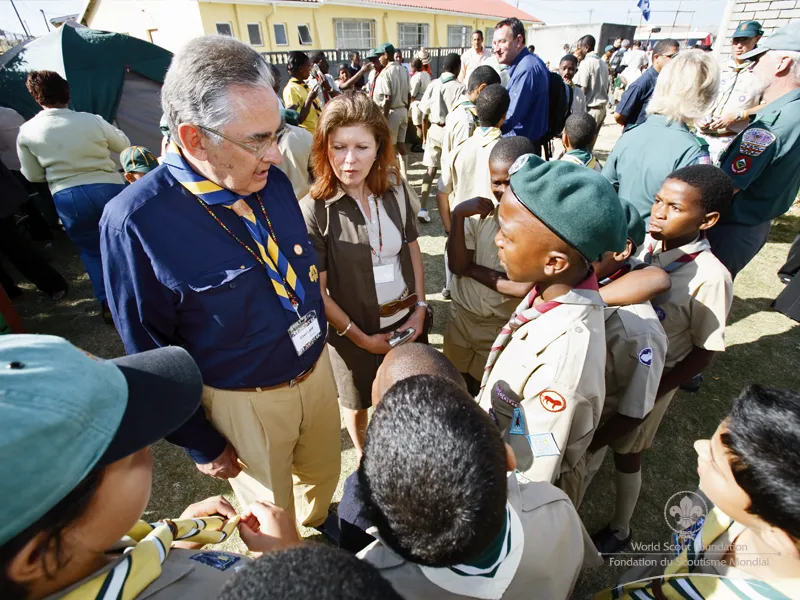 Charlotte and Eberhard von Koerber, long-time supporters of Scouting, are very familiar with South Africa – but meeting Thina and his troop in Gugulethu was an eye-opener for them. “They (Thina and his fellow Scouts) are well ahead of many organizations in South Africa today with their work with HIV/AIDS. As peer educators, they work with young people of their own age, and teach them about positive behaviour and action which will keep them safe from infection,” Eberhard reports. “The results are impressive – independent evaluations commissioned by donors show this – these Scouts are leading the field. But listening to Thina and his friends, it is clear to see why these young people are so successful! They have real energy and motivation – they are inspiring – and are clearly wonderful role models for their peers. They really do provide the hope that is necessary in the fight against HIV/AIDS.” ”And what is really impressive,” adds Charlotte, ”is their genuine concern for children already affected by the scourge of AIDS. To hear these young people talk is awe-inspiring. They are tackling taboos which go to the very heart of South African society today…they are helping young people orphaned by AIDS to integrate into their community…and HIV positive kids are welcomed into their Scout groups – without discrimination. Given the attitude of many in their communities, these Scouts are extremely brave.” “Maybe it’s because Scouting in South Africa has, over the years, led the way in combating racial discrimination within its membership that these young people have been empowered to take this stand – or maybe, like Scouts in the other 110 countries where Gifts for Peace programmes are in operation, it’s their Scout training that spurs them on to take action. But it is plain to see, through Scouting, these young men and women have learned how to exercise genuine leadership – you can see that this Movement has had a really positive impact on their young lives,” said Eberhard.